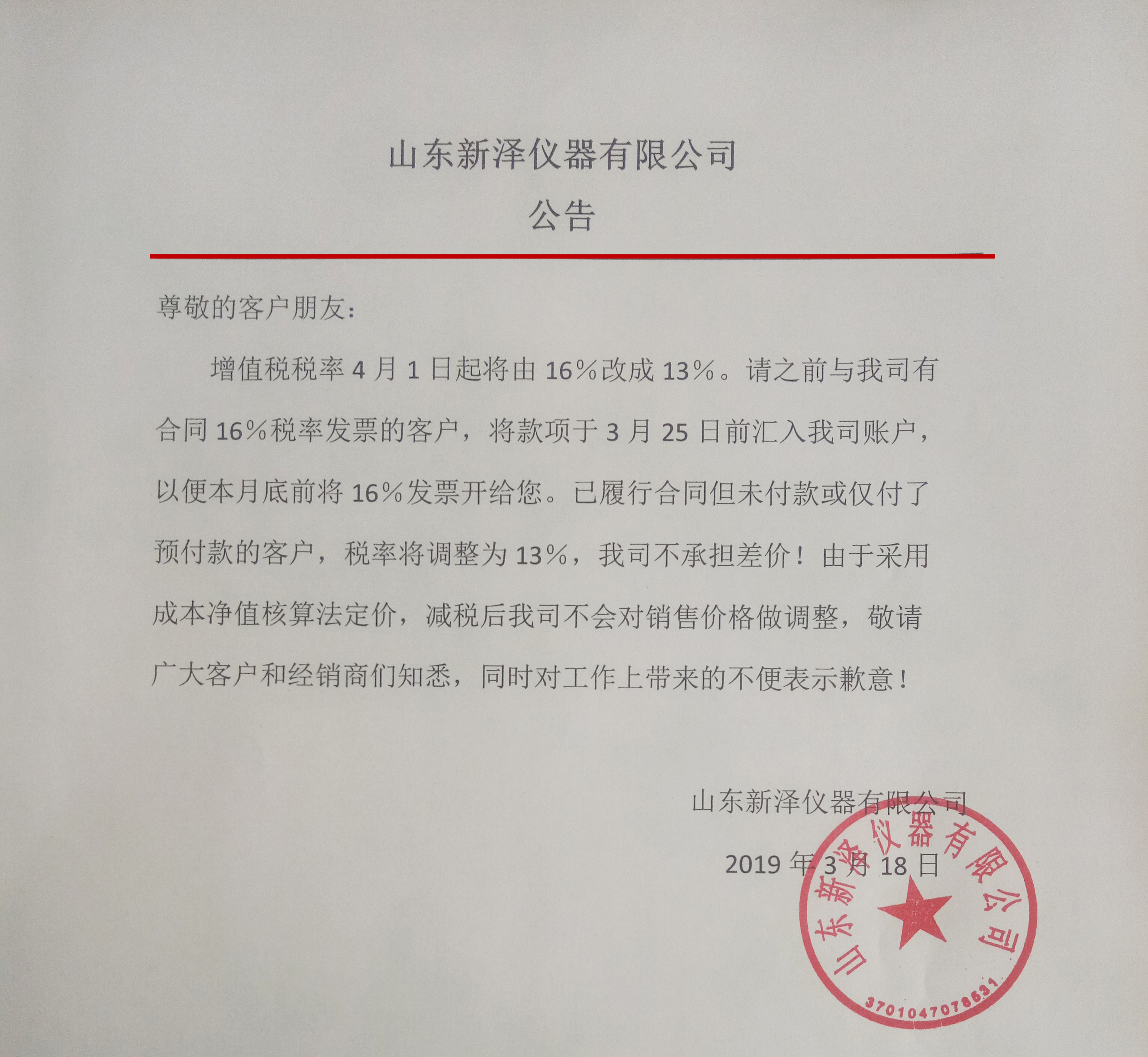 新澤公告:廣大客戶朋友,請注意增值稅稅率由16%降至13%