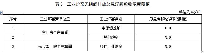 工業(yè)爐窯無組織排放總懸浮顆粒物濃度限值按表3規(guī)定執(zhí)行。