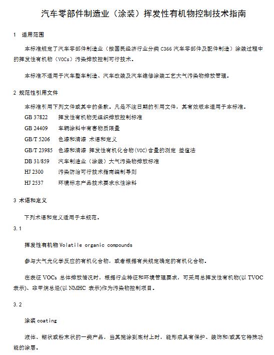 本標準規(guī)定了汽車零部件制造業(yè)(涂裝)揮發(fā)性有機物污染防治可行技術(shù)。 本規(guī)范按照GB/T 1.1-2009給出的規(guī)則起草。